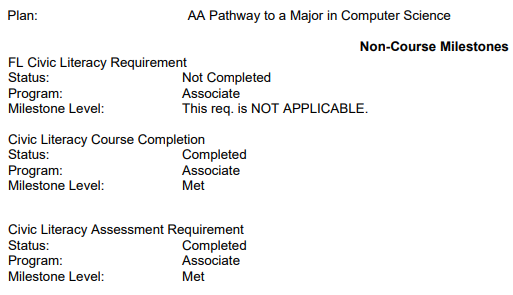 • The sections named ‘Civic Literacy Couse Completion’ and ‘Civic Literacy Assessment Completion’ are limited to AA and Baccalaureate degree students with an MDC requirement term of Fall 2021 and beyond; and AS degree students with an MDC requirement term of Fall 2022 and beyond.